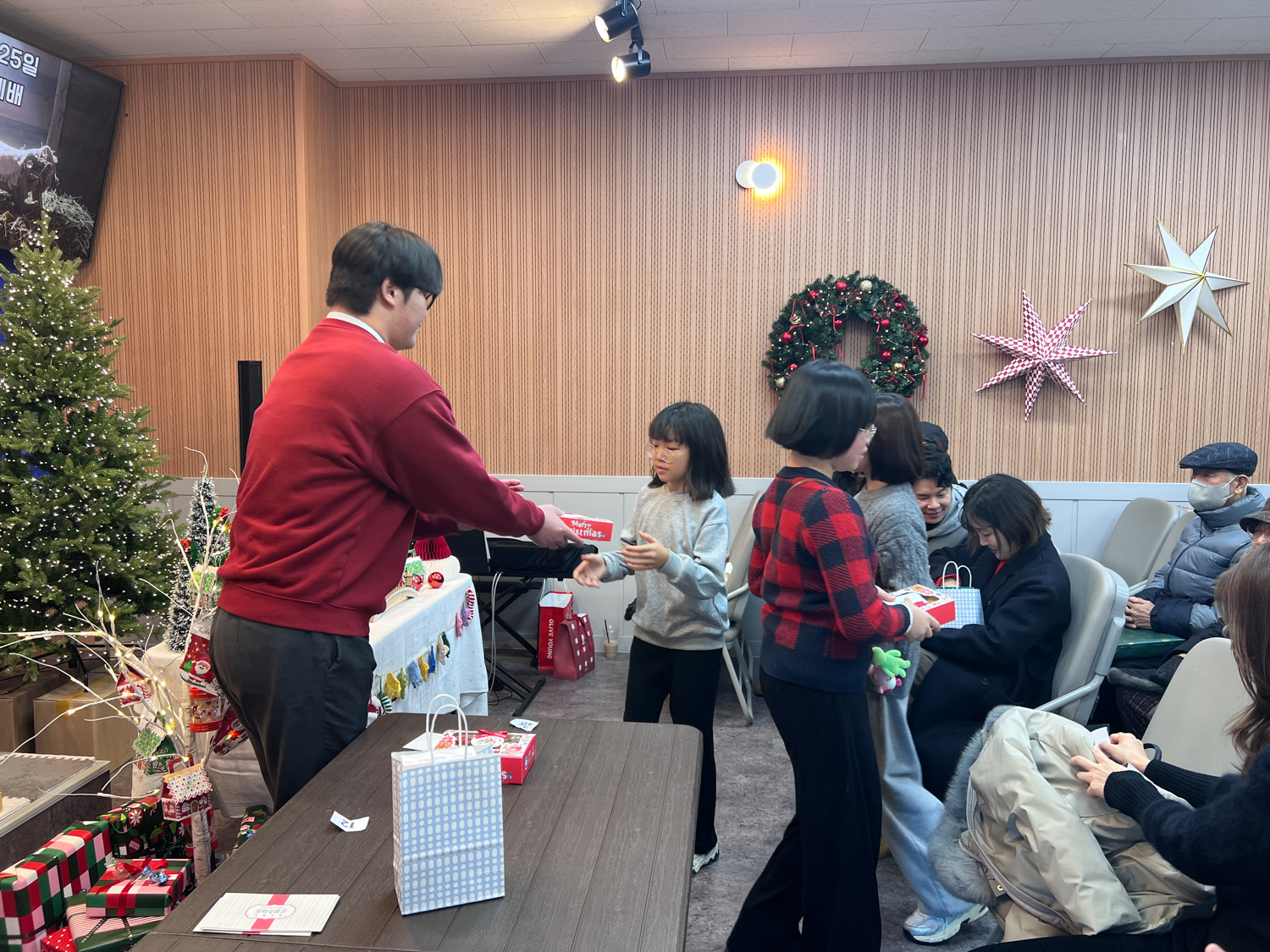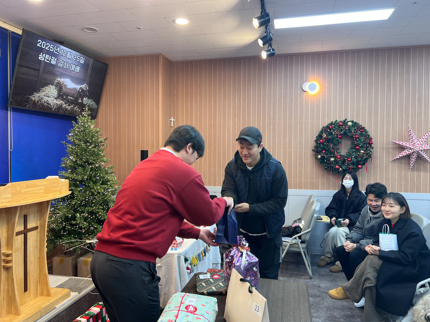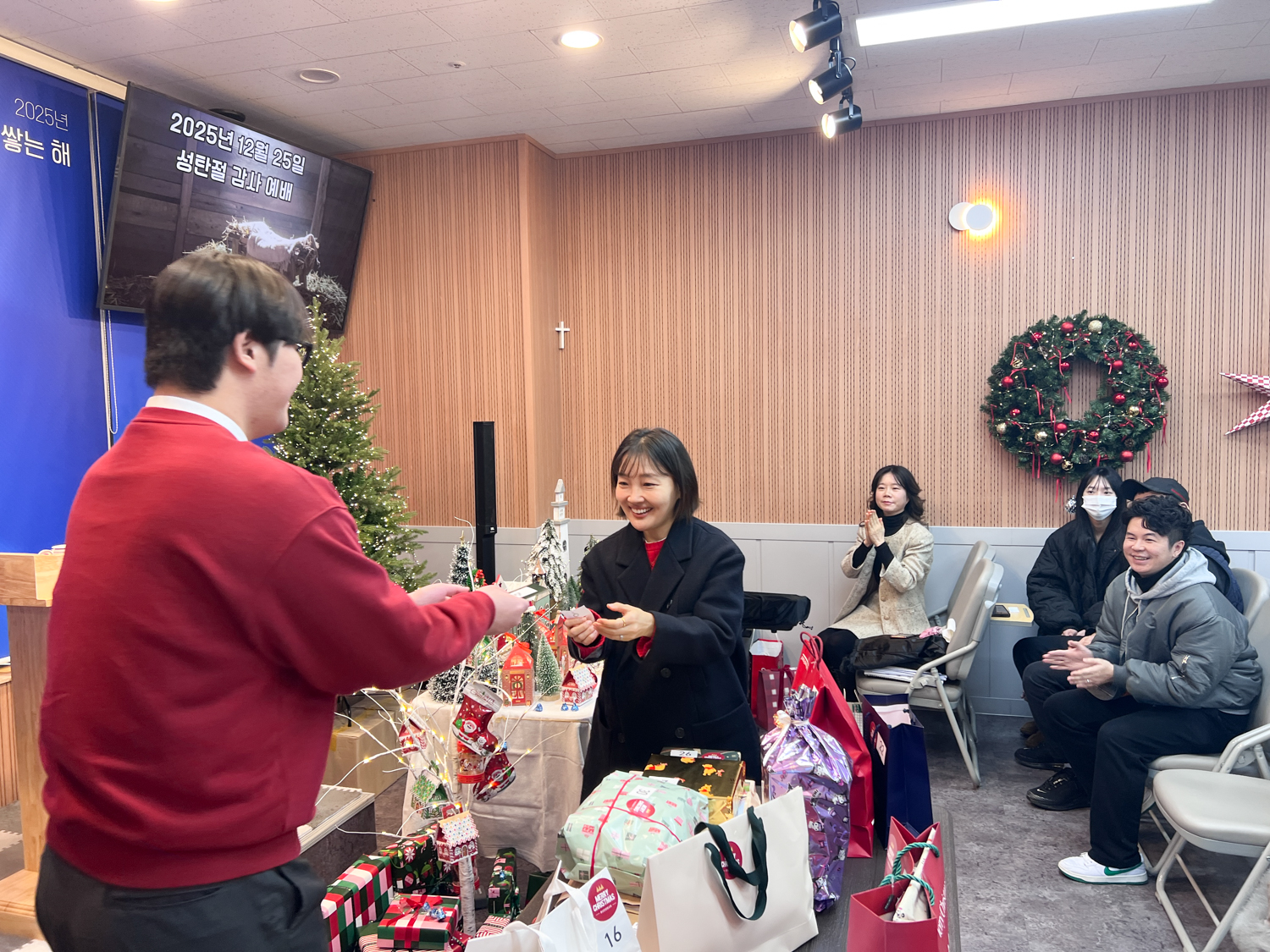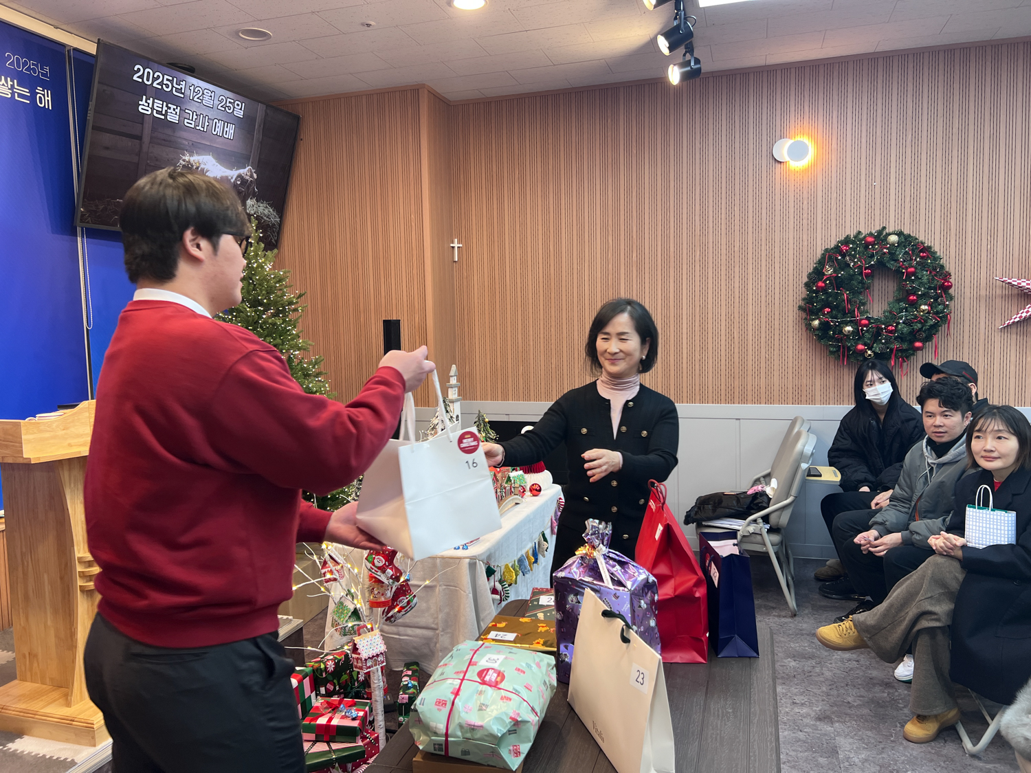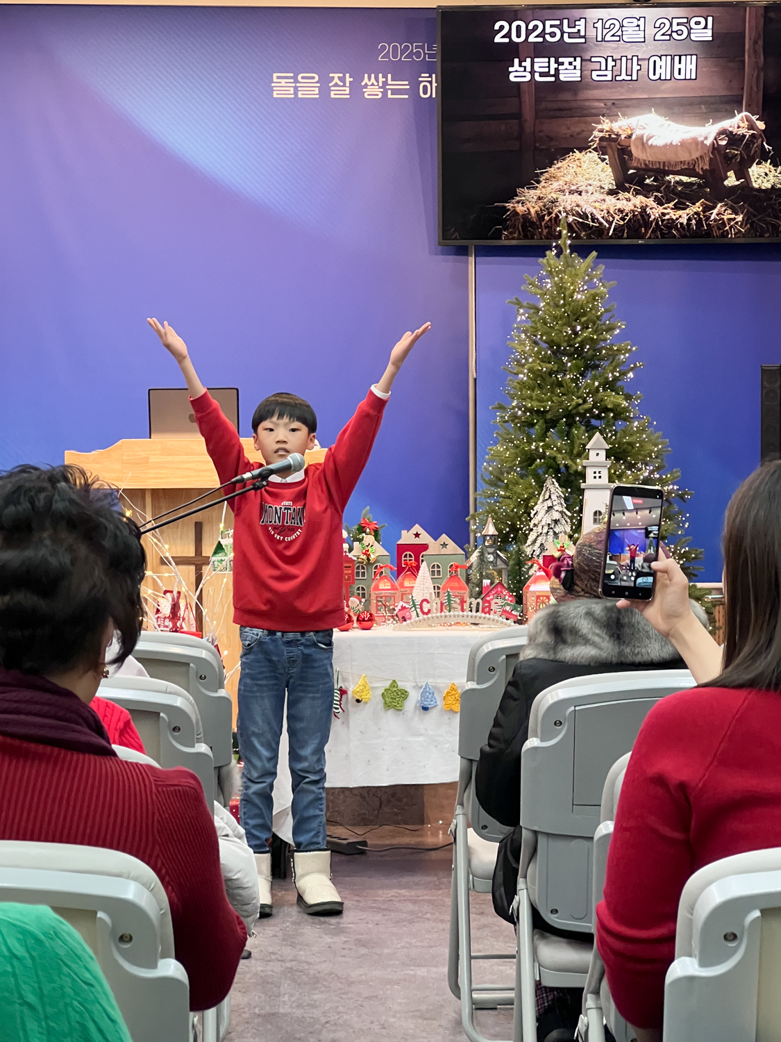 2025년 성탄절입니다. 예수님이 이 땅에 오신 것을 기념하는 날입니다 .오늘은 성탄절을 맞이해서 남,여 성도회가 특송을 준비했습니다. 또 주일학교 김재희군의 멋진 찬양과 랩 그리고 율동도 볼 수 있었습니다. 예배가 모두 끝난 뒤에는 선물도 나누었습니다.