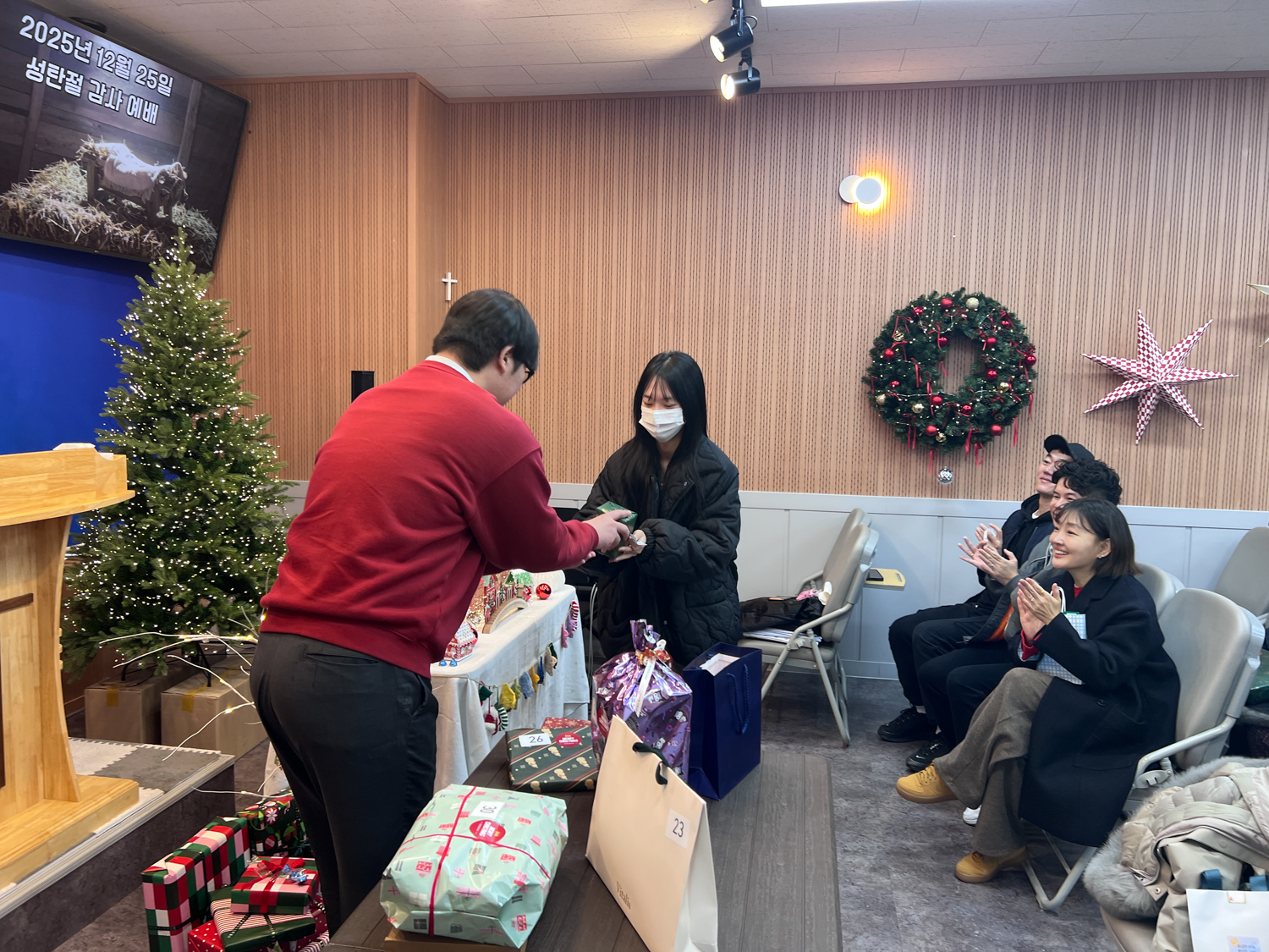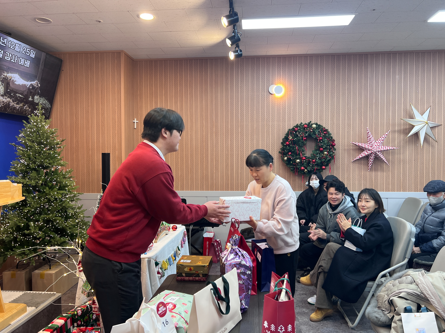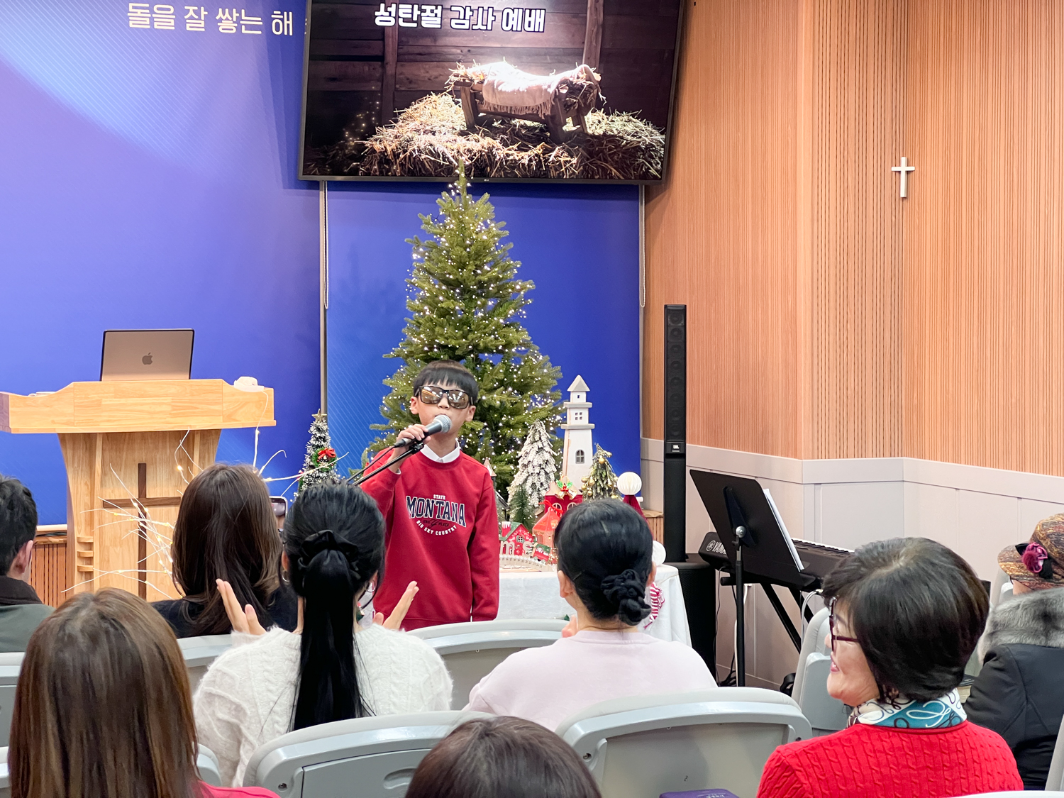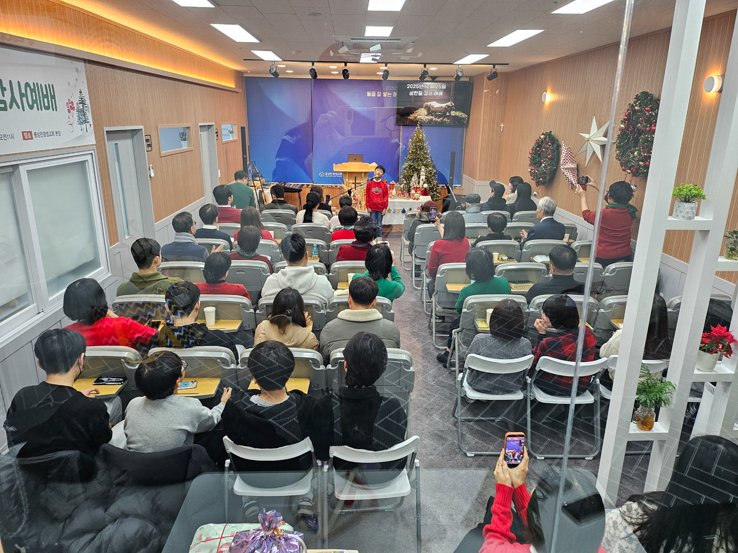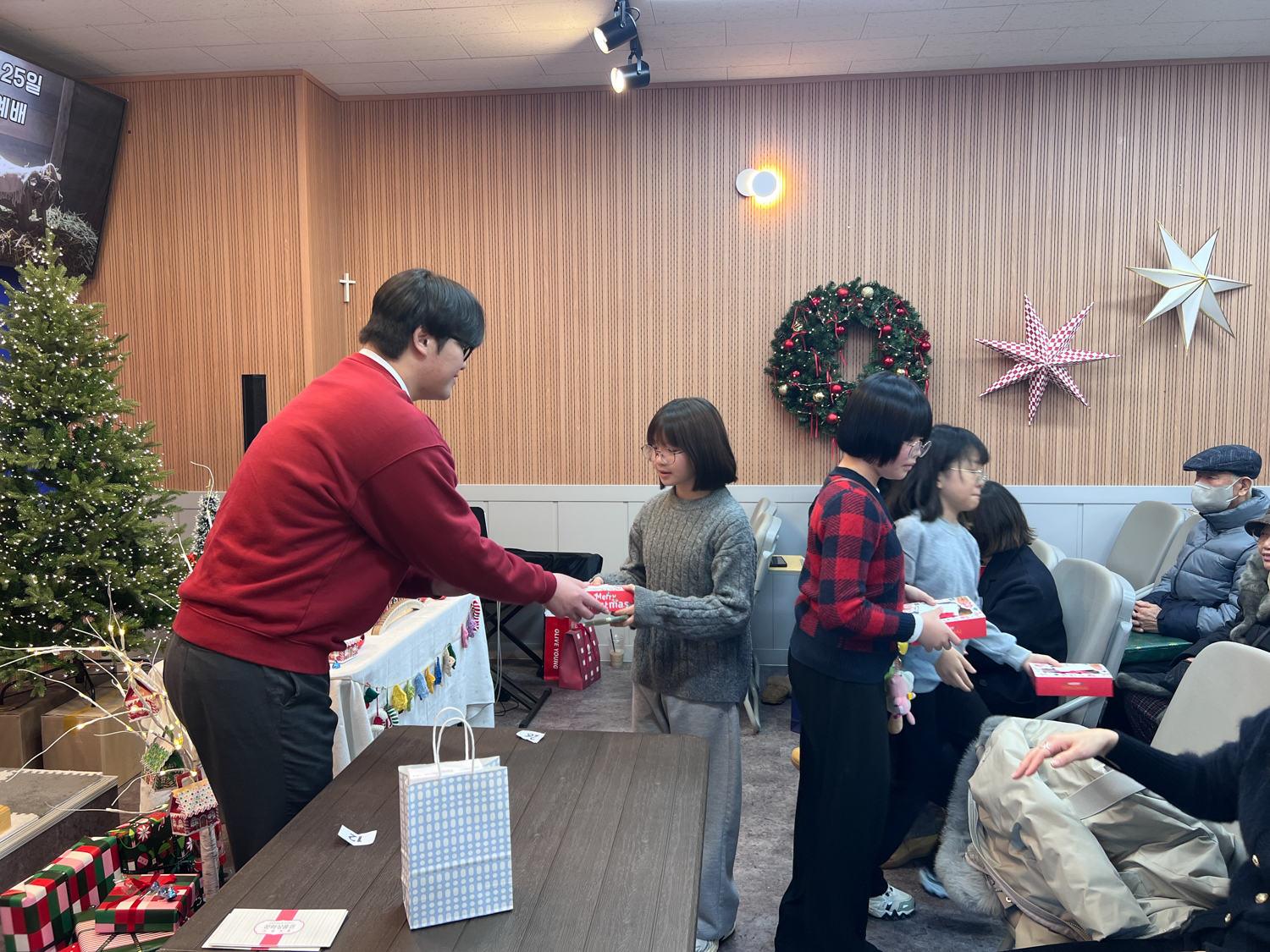 2025년 성탄절입니다. 예수님이 이 땅에 오신 것을 기념하는 날입니다 .오늘은 성탄절을 맞이해서 남,여 성도회가 특송을 준비했습니다. 또 주일학교 김재희군의 멋진 찬양과 랩 그리고 율동도 볼 수 있었습니다. 예배가 모두 끝난 뒤에는 선물도 나누었습니다.